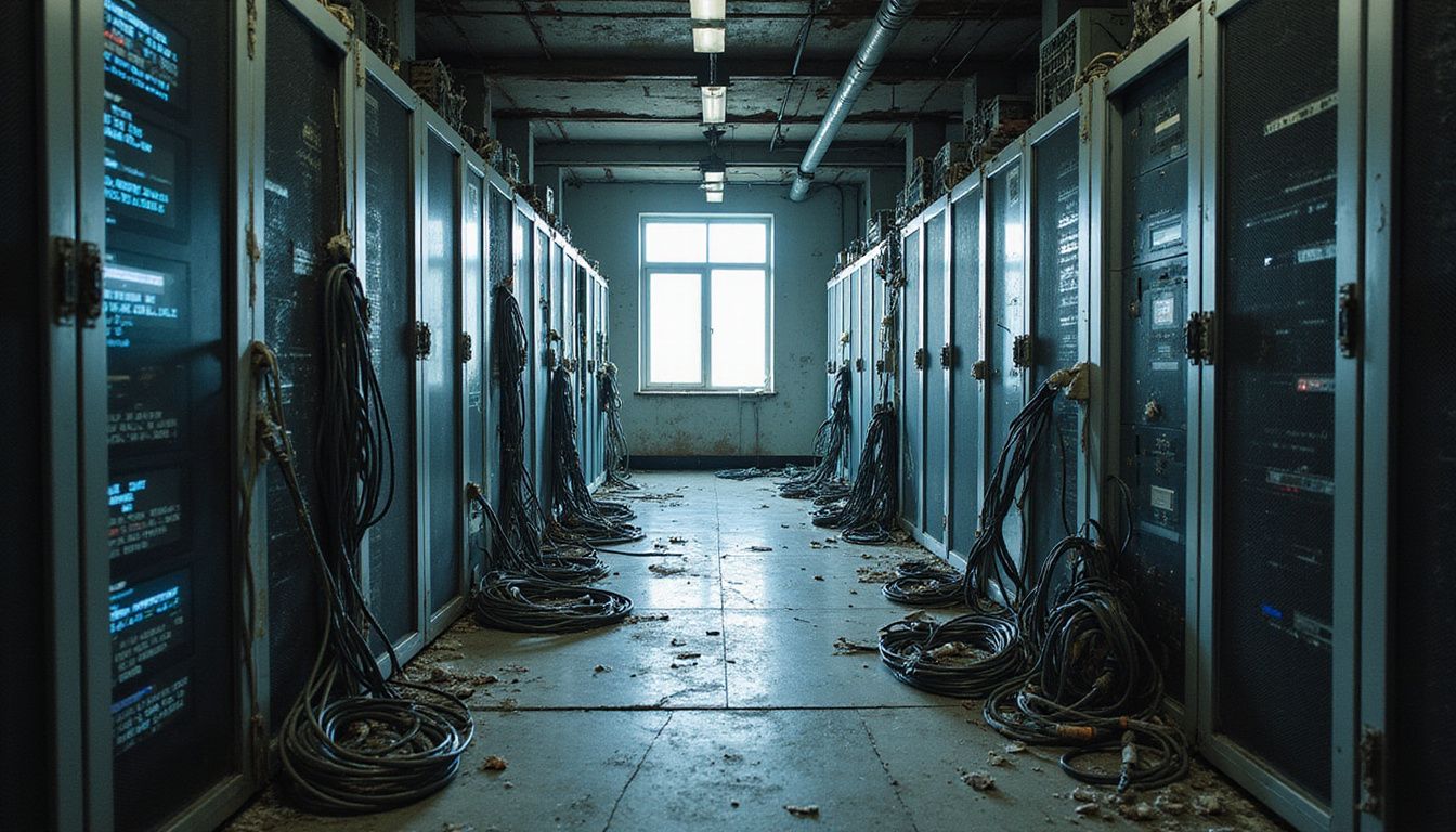 An abandoned data center room with aged server racks and malfunctioning AI.
